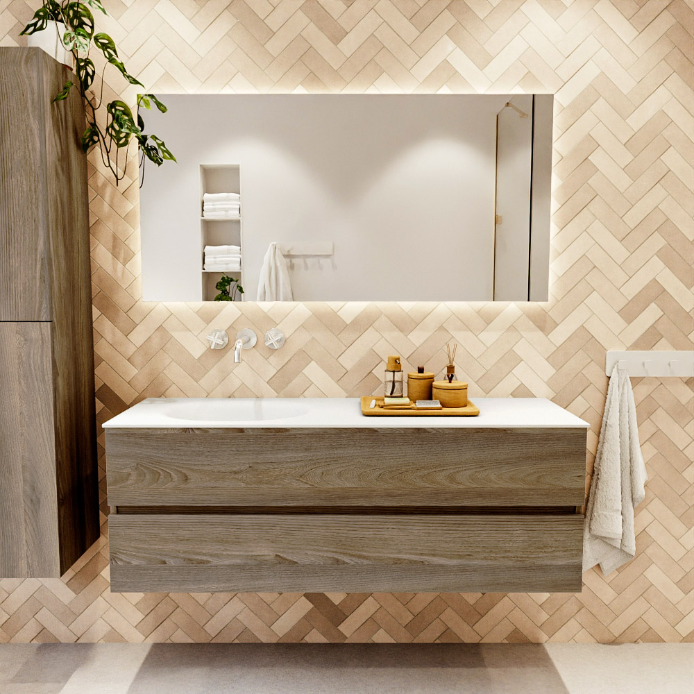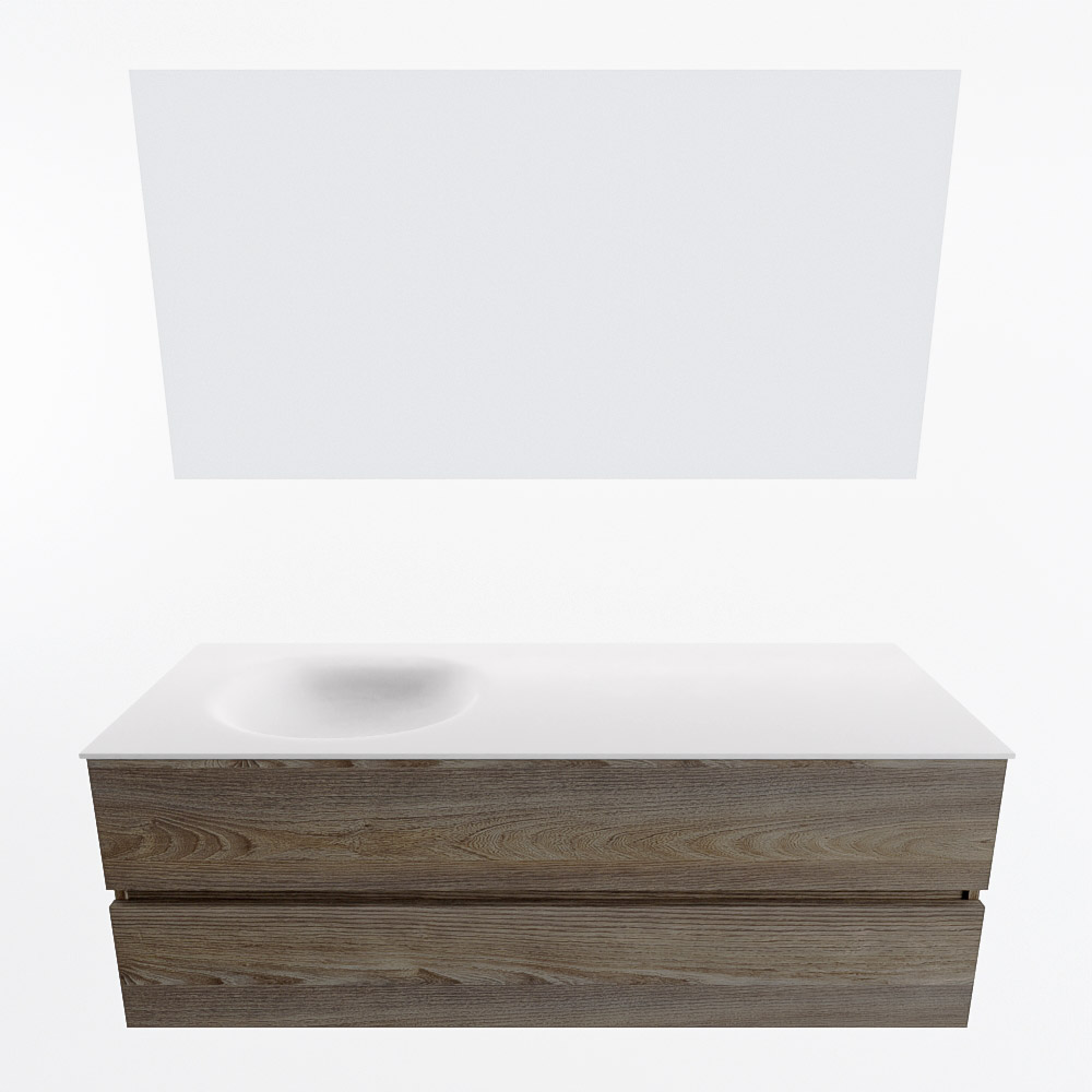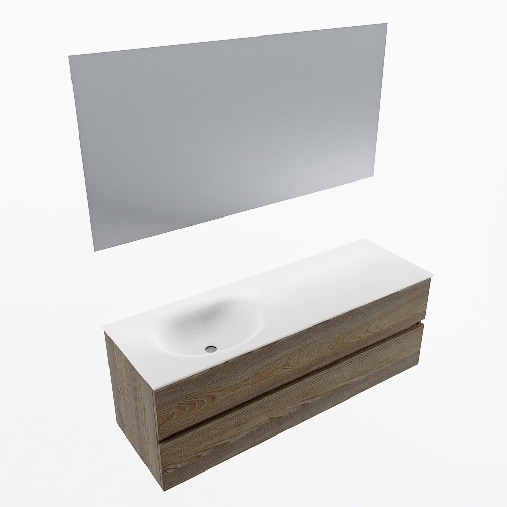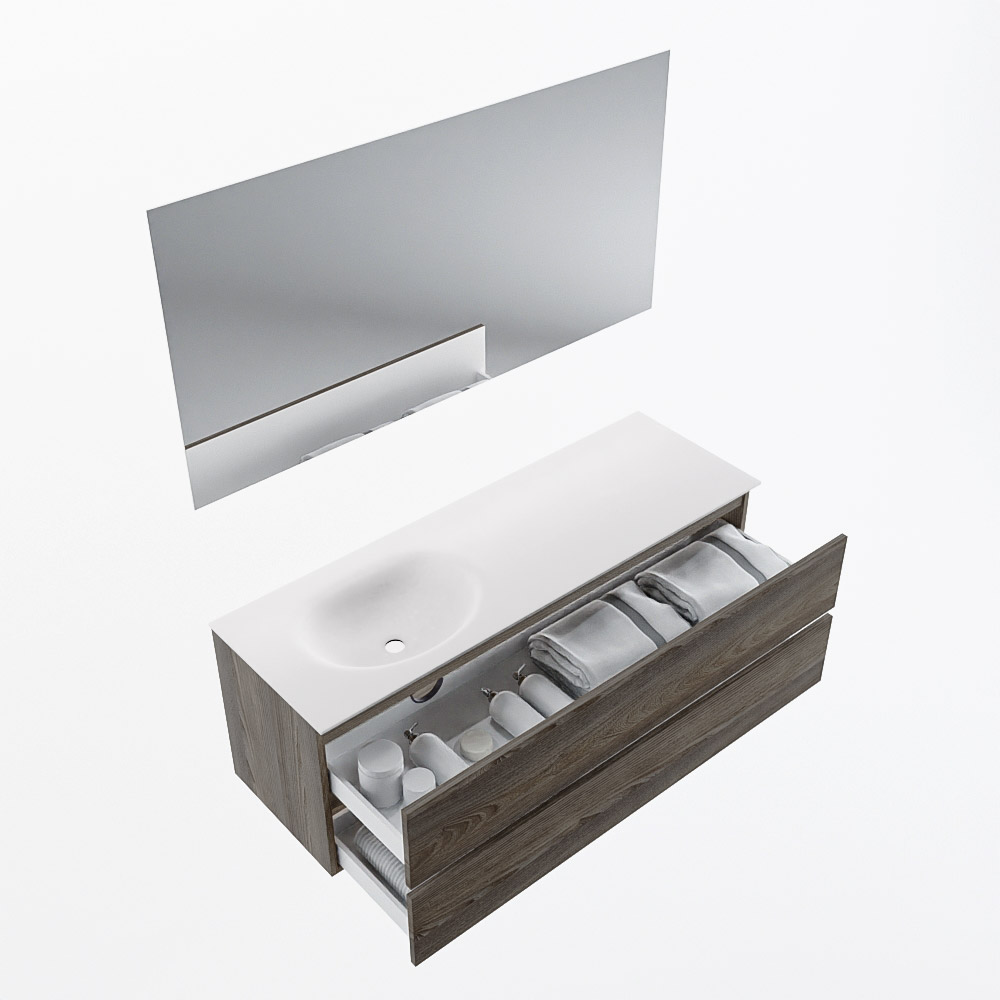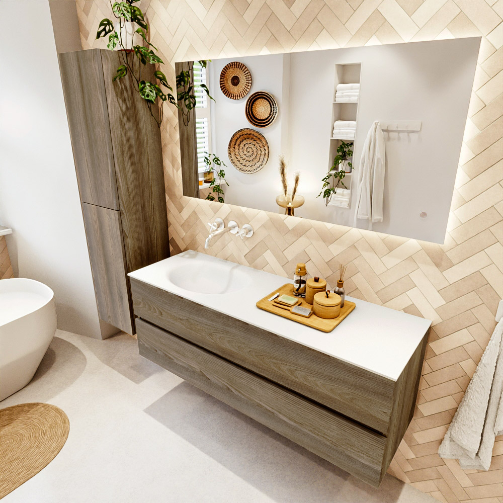 MONDIAZ VICA 140cm mueble de baño Dark Brown Grey 2 cajones. Lavabo MOON Izquierda sin orificio color Talc con espejo LED.
