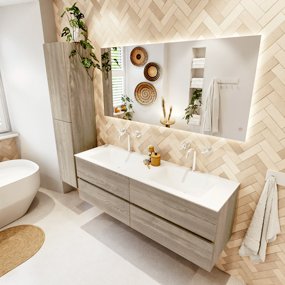Ya sea que elija un color o un acabado de madera, un mueble de baño a medida, con o sin agujeros para grifos, el conjunto de muebles de baño Vica lo tiene todo. Con la serie Vica, puede elegir entre 3 modelos de lavabos: CLOUD y MOON en Solid Surface, con opciones de lavabo a la derecha, izquierda, en el medio o doble, y con o sin agujeros para grifos. También está el lavabo de cerámica DENIA con opciones en el medio y doble. El conjunto de muebles de baño Vica está disponible en una amplia gama de tamaños estándar, desde 60 cm hasta 200 cm, que aumentan en incrementos de 10 cm. El mueble de baño Vica está disponible en hasta 25 colores, incluyendo nuestros colores especiales Oro y Plata. Si no encuentra el tamaño o color ideal, siempre es posible hacer un pedido a medida. También puede coordinar su baño completo con columnas, bañeras, nichos y accesorios, todos en el mismo color. Con el conjunto de muebles de baño Vica, tendrá un mueble fantástico que completa su baño.