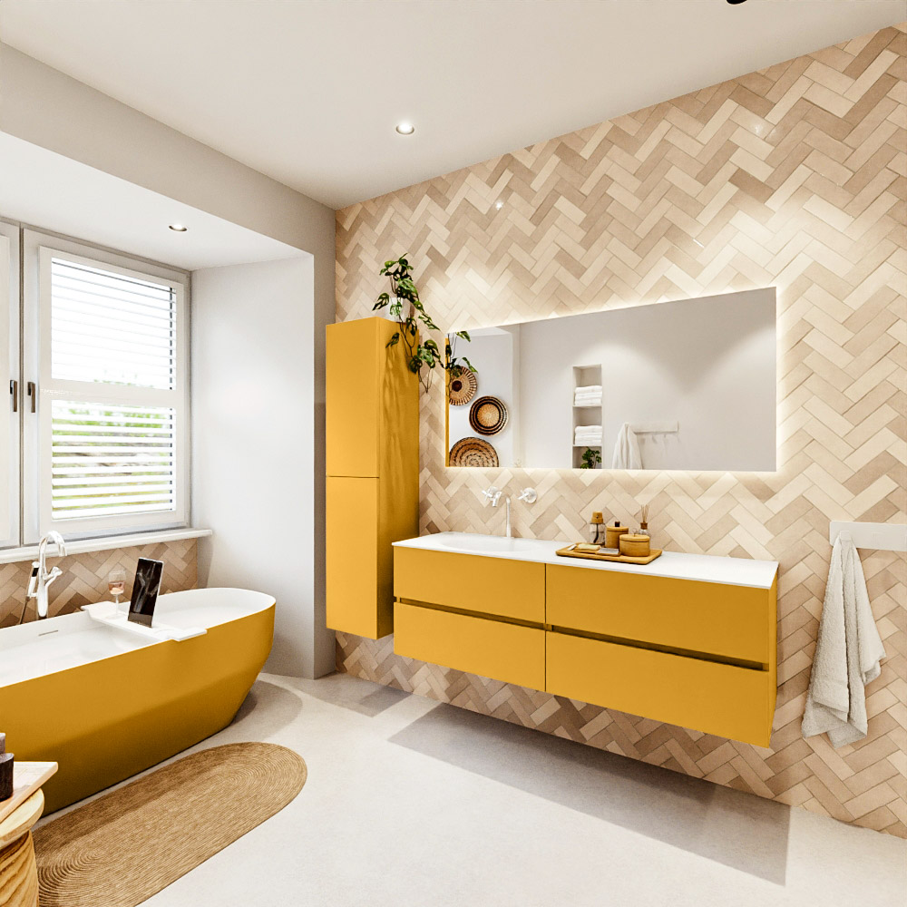 En español: Ya sea que elija un color o un acabado de madera, un mueble de baño a medida, con o sin agujeros para grifos, el conjunto de muebles de baño Vica lo tiene todo. Con la serie Vica, puede elegir entre 3 modelos de lavabos: CLOUD y MOON en Solid Surface, con opciones de lavabo a la derecha, izquierda, en el medio o doble, y con o sin agujeros para grifos. También está el lavabo de cerámica DENIA con opciones en el medio y doble. El conjunto de muebles de baño Vica está disponible en una amplia gama de tamaños estándar, desde 60 cm hasta 200 cm, que aumentan en incrementos de 10 cm. El mueble de baño Vica está disponible en hasta 25 colores, incluyendo nuestros colores especiales Oro y Plata. Si no encuentra el tamaño o color ideal, siempre es posible hacer un pedido a medida. También puede coordinar su baño completo con columnas, bañeras, nichos y accesorios, todos en el mismo color. Con el conjunto de muebles de baño Vica, tendrá un mueble fantástico que completa su baño.