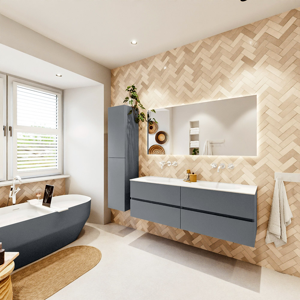 En español: Ya sea que elija un color o un acabado de madera, un mueble de baño a medida, con o sin agujeros para grifos, el conjunto de muebles de baño Vica lo tiene todo. Con la serie Vica, puede elegir entre 3 modelos de lavabos: CLOUD y MOON en Solid Surface, con opciones de lavabo a la derecha, izquierda, en el medio o doble, y con o sin agujeros para grifos. También está el lavabo de cerámica DENIA con opciones en el medio y doble. El conjunto de muebles de baño Vica está disponible en una amplia gama de tamaños estándar, desde 60 cm hasta 200 cm, que aumentan en incrementos de 10 cm. El mueble de baño Vica está disponible en hasta 25 colores, incluyendo nuestros colores especiales Oro y Plata. Si no encuentra el tamaño o color ideal, siempre es posible hacer un pedido a medida. También puede coordinar su baño completo con columnas, bañeras, nichos y accesorios, todos en el mismo color. Con el conjunto de muebles de baño Vica, tendrá un mueble fantástico que completa su baño.