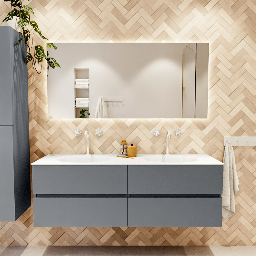 En español: Ya sea que elija un color o un acabado de madera, un mueble de baño a medida, con o sin agujeros para grifos, el conjunto de muebles de baño Vica lo tiene todo. Con la serie Vica, puede elegir entre 3 modelos de lavabos: CLOUD y MOON en Solid Surface, con opciones de lavabo a la derecha, izquierda, en el medio o doble, y con o sin agujeros para grifos. También está el lavabo de cerámica DENIA con opciones en el medio y doble. El conjunto de muebles de baño Vica está disponible en una amplia gama de tamaños estándar, desde 60 cm hasta 200 cm, que aumentan en incrementos de 10 cm. El mueble de baño Vica está disponible en hasta 25 colores, incluyendo nuestros colores especiales Oro y Plata. Si no encuentra el tamaño o color ideal, siempre es posible hacer un pedido a medida. También puede coordinar su baño completo con columnas, bañeras, nichos y accesorios, todos en el mismo color. Con el conjunto de muebles de baño Vica, tendrá un mueble fantástico que completa su baño.
