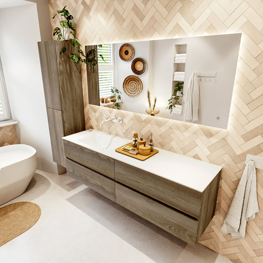 Ya sea que elija un color o un acabado de madera, un mueble de baño a medida, con o sin agujeros para grifos, el conjunto de muebles de baño Vica lo tiene todo. Con la serie Vica, puede elegir entre 3 modelos de lavabos: CLOUD y MOON en Solid Surface, con opciones de lavabo a la derecha, izquierda, en el medio o doble, y con o sin agujeros para grifos. También está el lavabo de cerámica DENIA con opciones en el medio y doble. El conjunto de muebles de baño Vica está disponible en una amplia gama de tamaños estándar, desde 60 cm hasta 200 cm, que aumentan en incrementos de 10 cm. El mueble de baño Vica está disponible en hasta 25 colores, incluyendo nuestros colores especiales Oro y Plata. Si no encuentra el tamaño o color ideal, siempre es posible hacer un pedido a medida. También puede coordinar su baño completo con columnas, bañeras, nichos y accesorios, todos en el mismo color. Con el conjunto de muebles de baño Vica, tendrá un mueble fantástico que completa su baño.