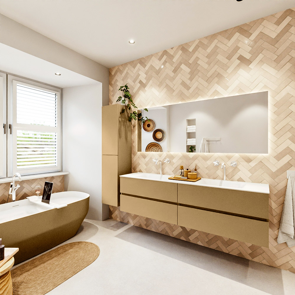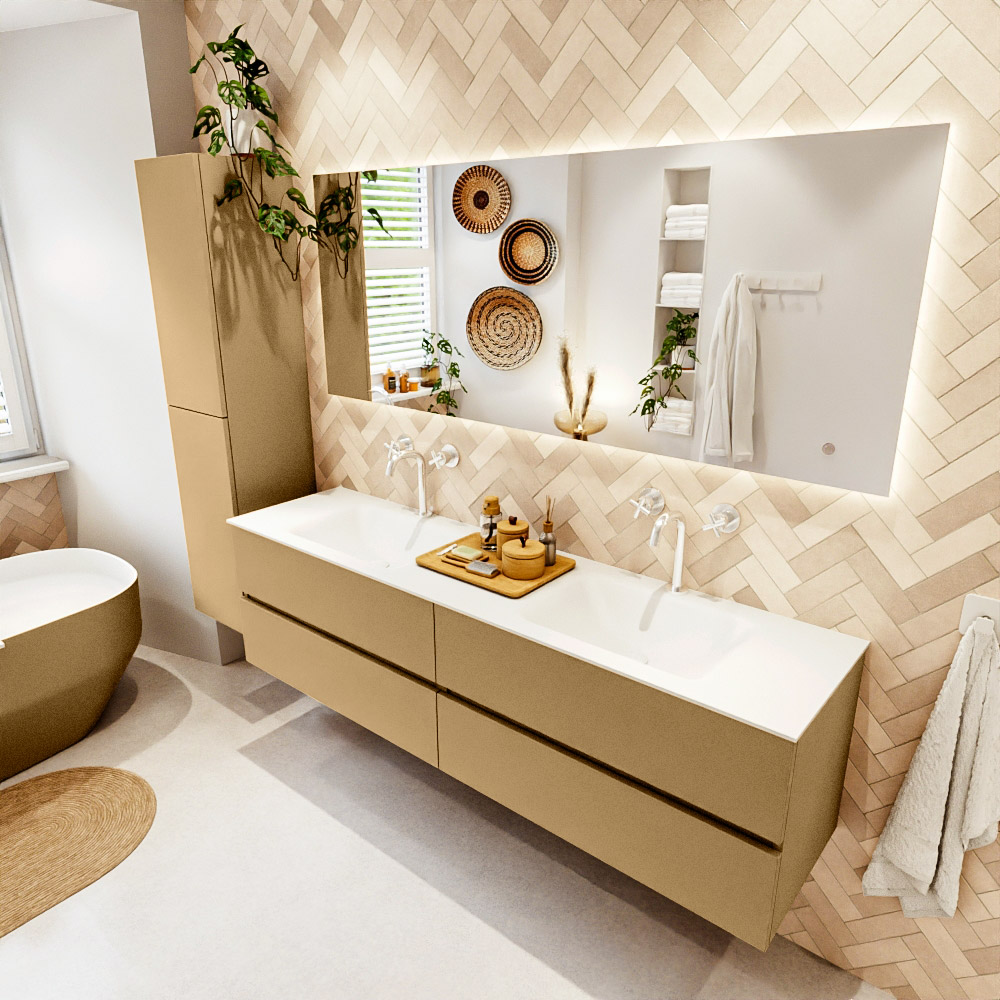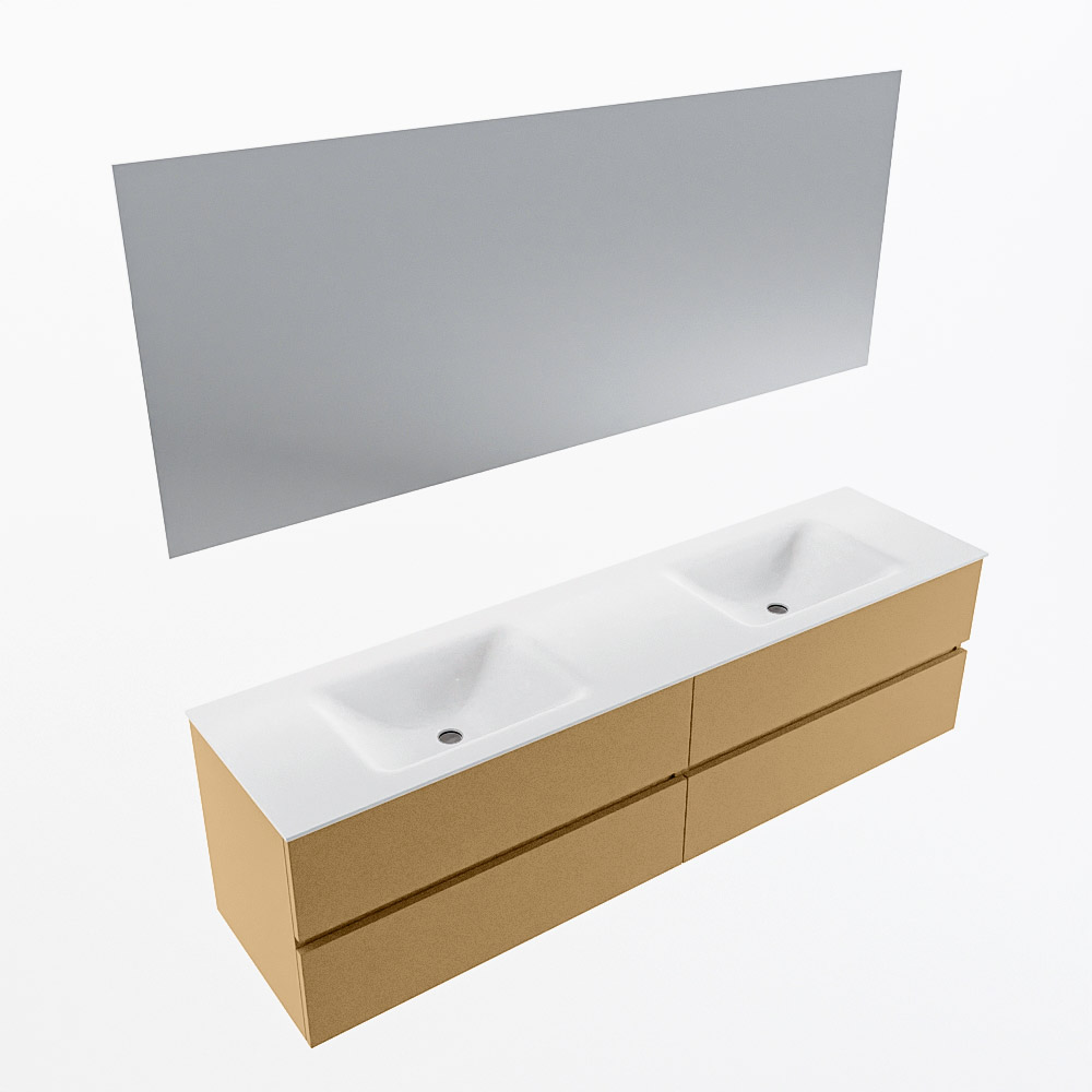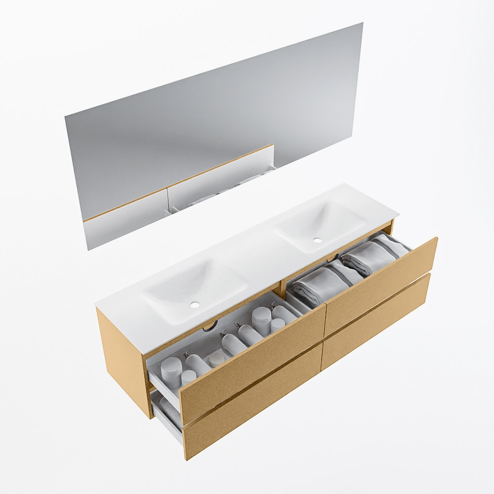 MONDIAZ VICA 180cm mueble de baño Oro 4 cajones. Lavabo CLOUD Doble 2 orificios color Talc con espejo LED.