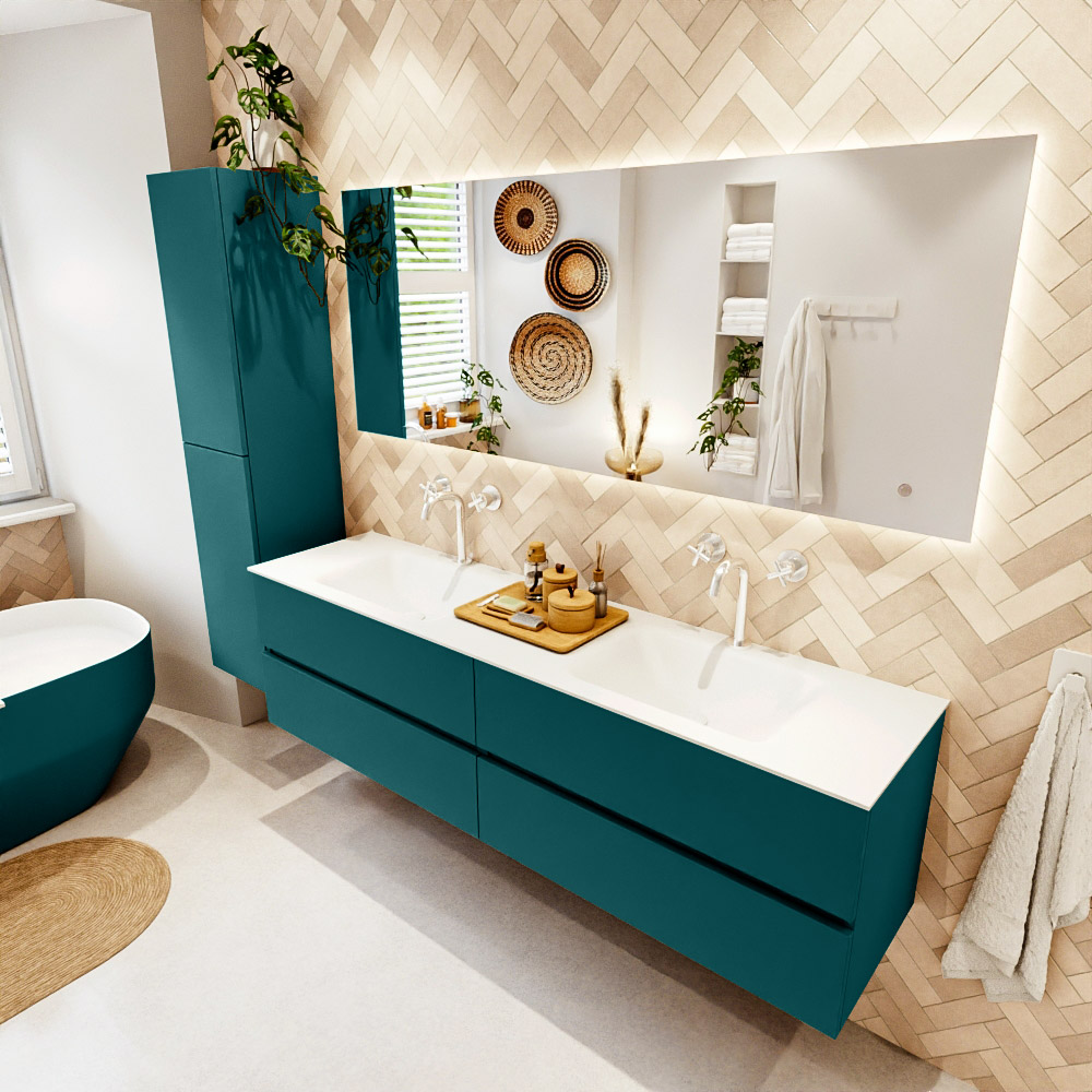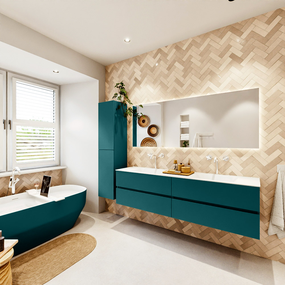 En español: Ya sea que elija un color o un acabado de madera, un mueble de baño a medida, con o sin agujeros para grifos, el conjunto de muebles de baño Vica lo tiene todo. Con la serie Vica, puede elegir entre 3 modelos de lavabos: CLOUD y MOON en Solid Surface, con opciones de lavabo a la derecha, izquierda, en el medio o doble, y con o sin agujeros para grifos. También está el lavabo de cerámica DENIA con opciones en el medio y doble. El conjunto de muebles de baño Vica está disponible en una amplia gama de tamaños estándar, desde 60 cm hasta 200 cm, que aumentan en incrementos de 10 cm. El mueble de baño Vica está disponible en hasta 25 colores, incluyendo nuestros colores especiales Oro y Plata. Si no encuentra el tamaño o color ideal, siempre es posible hacer un pedido a medida. También puede coordinar su baño completo con columnas, bañeras, nichos y accesorios, todos en el mismo color. Con el conjunto de muebles de baño Vica, tendrá un mueble fantástico que completa su baño.