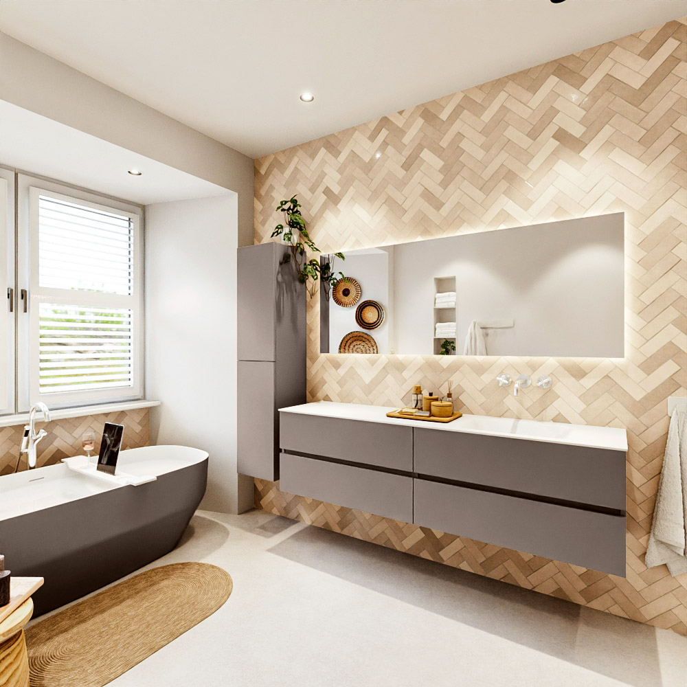Ya sea que elija un color o un acabado de madera, un mueble de baño a medida, con o sin agujeros para grifos, el conjunto de muebles de baño Vica lo tiene todo. Con la serie Vica, puede elegir entre 3 modelos de lavabos: CLOUD y MOON en Solid Surface, con opciones de lavabo a la derecha, izquierda, en el medio o doble, y con o sin agujeros para grifos. También está el lavabo de cerámica DENIA con opciones en el medio y doble. El conjunto de muebles de baño Vica está disponible en una amplia gama de tamaños estándar, desde 60 cm hasta 200 cm, que aumentan en incrementos de 10 cm. El mueble de baño Vica está disponible en hasta 25 colores, incluyendo nuestros colores especiales Oro y Plata. Si no encuentra el tamaño o color ideal, siempre es posible hacer un pedido a medida. También puede coordinar su baño completo con columnas, bañeras, nichos y accesorios, todos en el mismo color. Con el conjunto de muebles de baño Vica, tendrá un mueble fantástico que completa su baño.