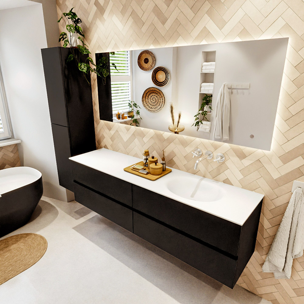 Ya sea que elija un color o un acabado de madera, un mueble de baño a medida, con o sin agujeros para grifos, el conjunto de muebles de baño Vica lo tiene todo. Con la serie Vica, puede elegir entre 3 modelos de lavabos: CLOUD y MOON en Solid Surface, con opciones de lavabo a la derecha, izquierda, en el medio o doble, y con o sin agujeros para grifos. También está el lavabo de cerámica DENIA con opciones en el medio y doble. El conjunto de muebles de baño Vica está disponible en una amplia gama de tamaños estándar, desde 60 cm hasta 200 cm, que aumentan en incrementos de 10 cm. El mueble de baño Vica está disponible en hasta 25 colores, incluyendo nuestros colores especiales Oro y Plata. Si no encuentra el tamaño o color ideal, siempre es posible hacer un pedido a medida. También puede coordinar su baño completo con columnas, bañeras, nichos y accesorios, todos en el mismo color. Con el conjunto de muebles de baño Vica, tendrá un mueble fantástico que completa su baño.