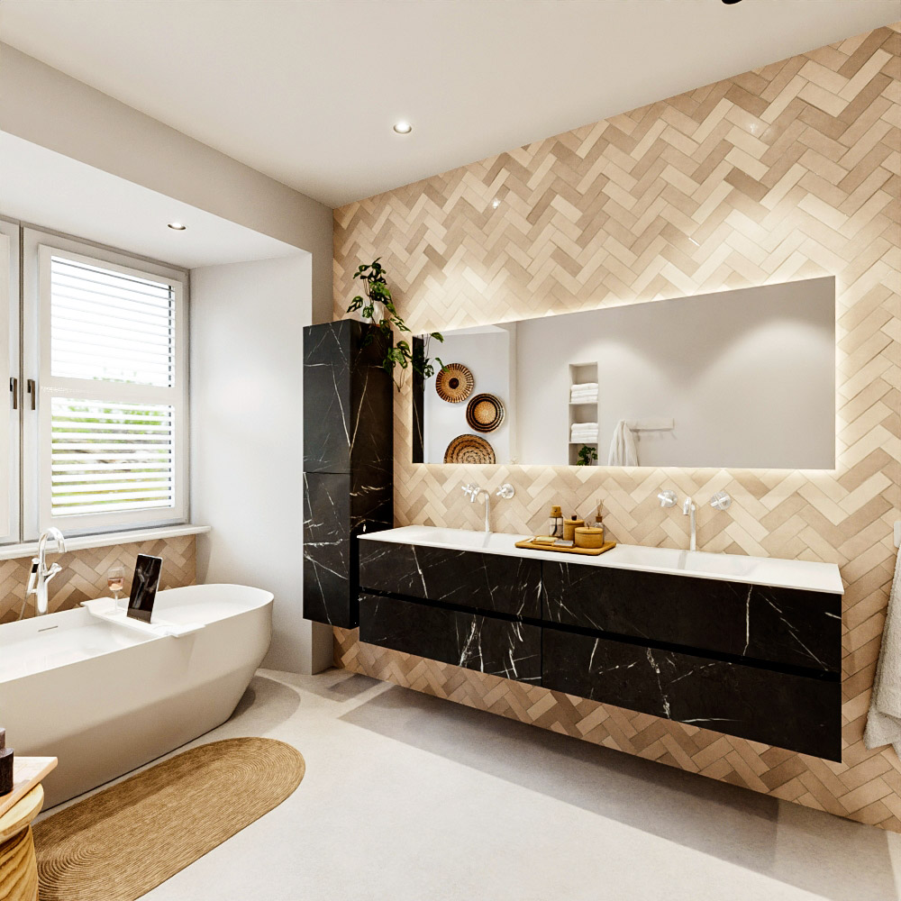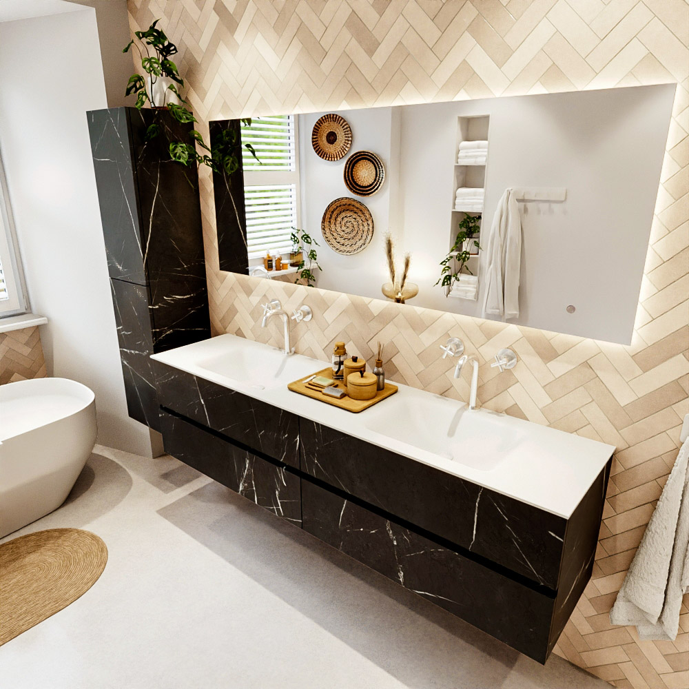 Ya sea que elija un color o un acabado de madera, un mueble de baño a medida, con o sin agujeros para grifos, el conjunto de muebles de baño Vica lo tiene todo. Con la serie Vica, puede elegir entre 3 modelos de lavabos: CLOUD y MOON en Solid Surface, con opciones de lavabo a la derecha, izquierda, en el medio o doble, y con o sin agujeros para grifos. También está el lavabo de cerámica DENIA con opciones en el medio y doble. El conjunto de muebles de baño Vica está disponible en una amplia gama de tamaños estándar, desde 60 cm hasta 200 cm, que aumentan en incrementos de 10 cm. El mueble de baño Vica está disponible en hasta 25 colores, incluyendo nuestros colores especiales Oro y Plata. Si no encuentra el tamaño o color ideal, siempre es posible hacer un pedido a medida. También puede coordinar su baño completo con columnas, bañeras, nichos y accesorios, todos en el mismo color. Con el conjunto de muebles de baño Vica, tendrá un mueble fantástico que completa su baño.