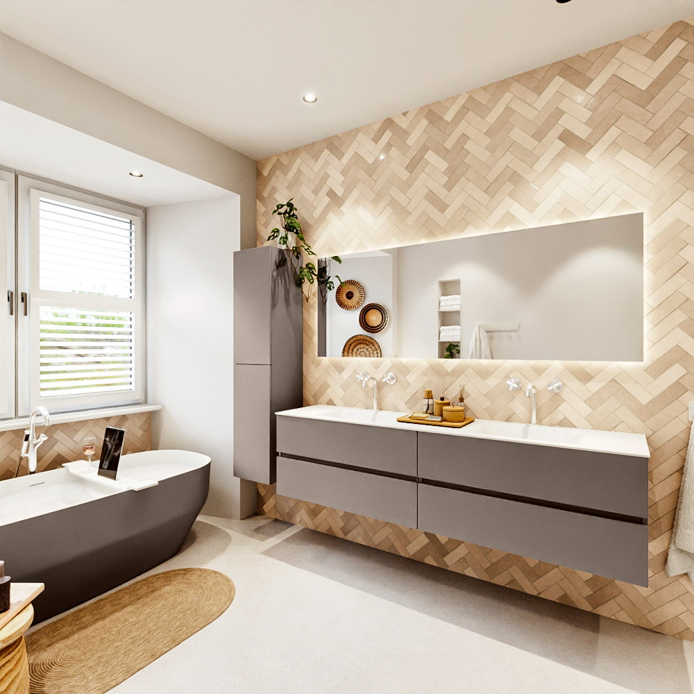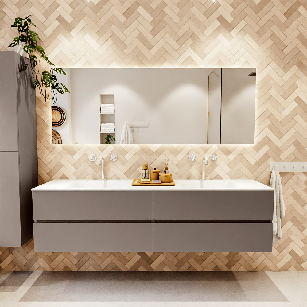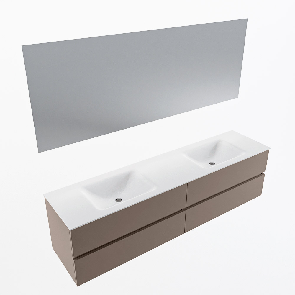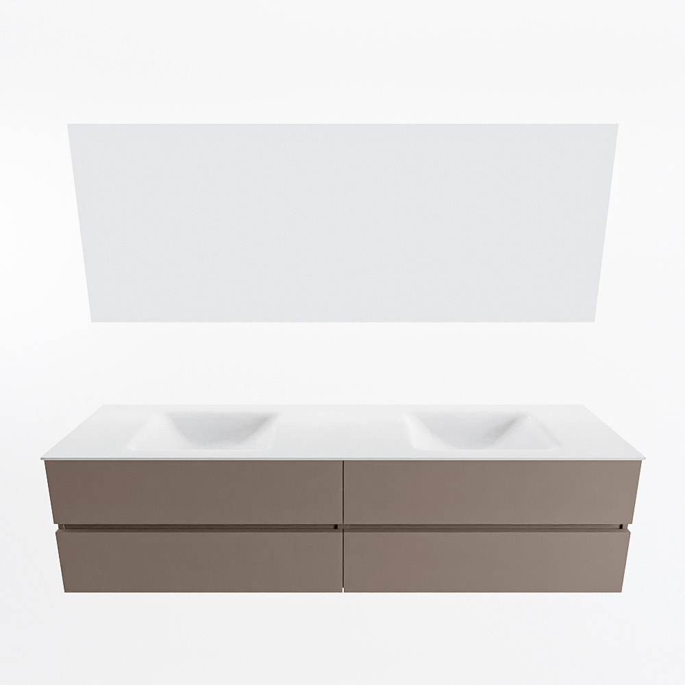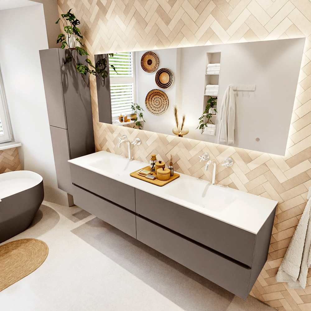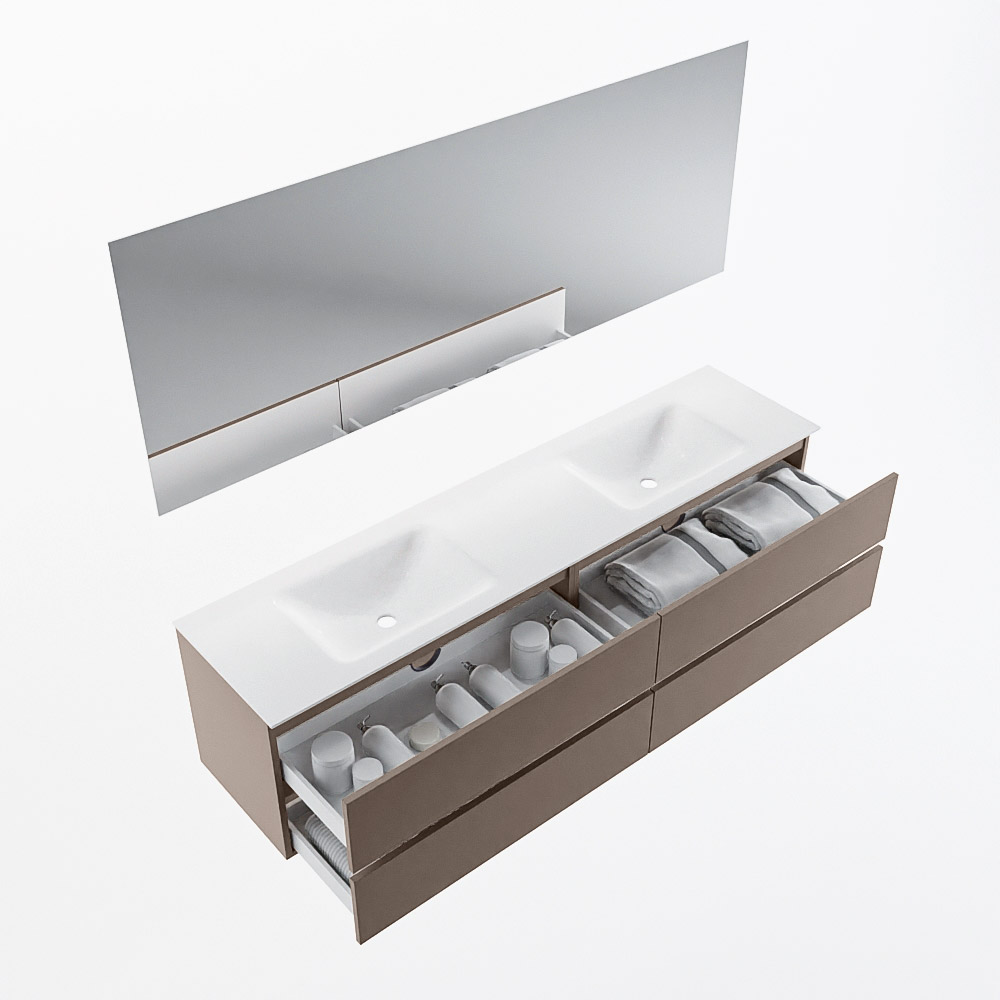 MONDIAZ VICA 190cm mueble de baño Smoke 4 cajones. Lavabo CLOUD Doble 2 orificios color Talc con espejo LED.