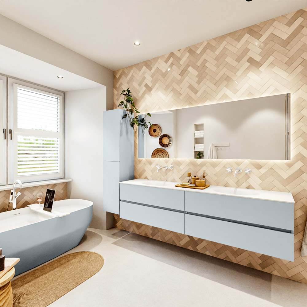 En español: Ya sea que elija un color o un acabado de madera, un mueble de baño a medida, con o sin agujeros para grifos, el conjunto de muebles de baño Vica lo tiene todo. Con la serie Vica, puede elegir entre 3 modelos de lavabos: CLOUD y MOON en Solid Surface, con opciones de lavabo a la derecha, izquierda, en el medio o doble, y con o sin agujeros para grifos. También está el lavabo de cerámica DENIA con opciones en el medio y doble. El conjunto de muebles de baño Vica está disponible en una amplia gama de tamaños estándar, desde 60 cm hasta 200 cm, que aumentan en incrementos de 10 cm. El mueble de baño Vica está disponible en hasta 25 colores, incluyendo nuestros colores especiales Oro y Plata. Si no encuentra el tamaño o color ideal, siempre es posible hacer un pedido a medida. También puede coordinar su baño completo con columnas, bañeras, nichos y accesorios, todos en el mismo color. Con el conjunto de muebles de baño Vica, tendrá un mueble fantástico que completa su baño.