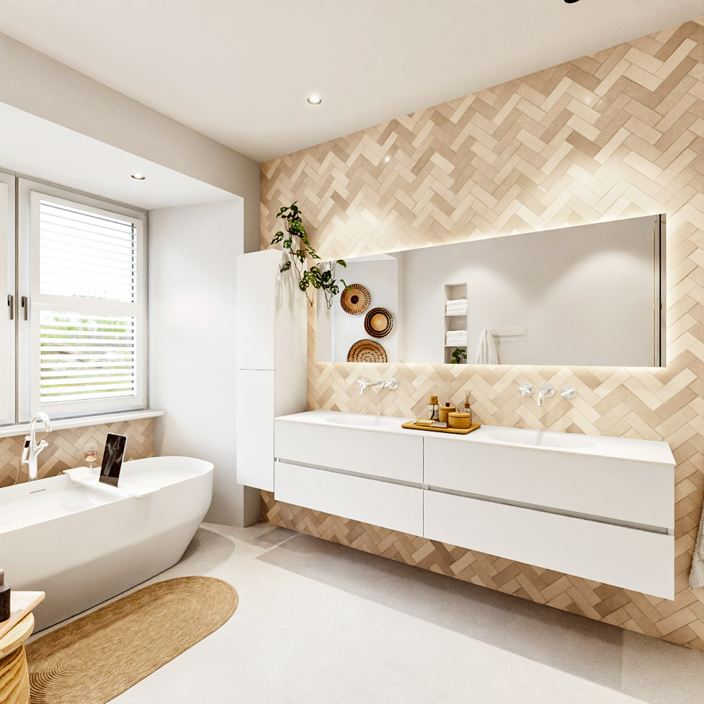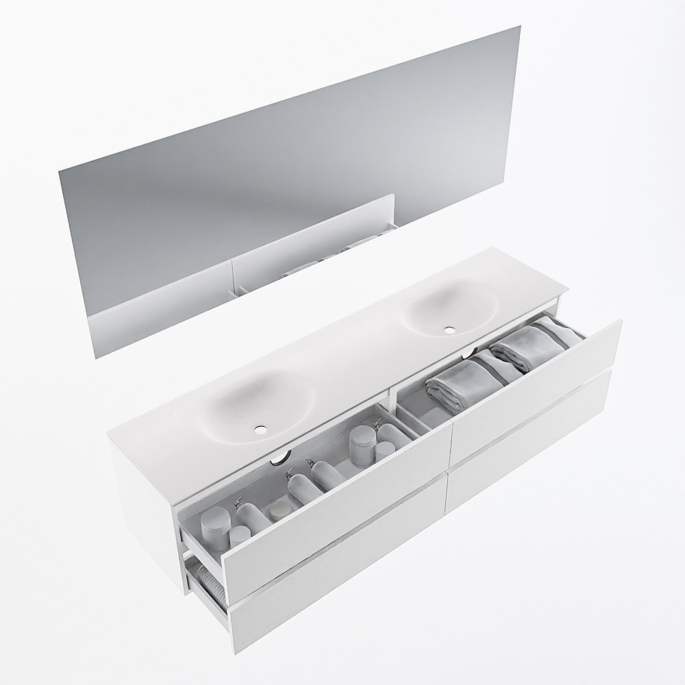 MONDIAZ VICA 200cm mueble de baño Talc 4 cajones. Lavabo MOON Doble sin orificio color Talc con espejo LED.