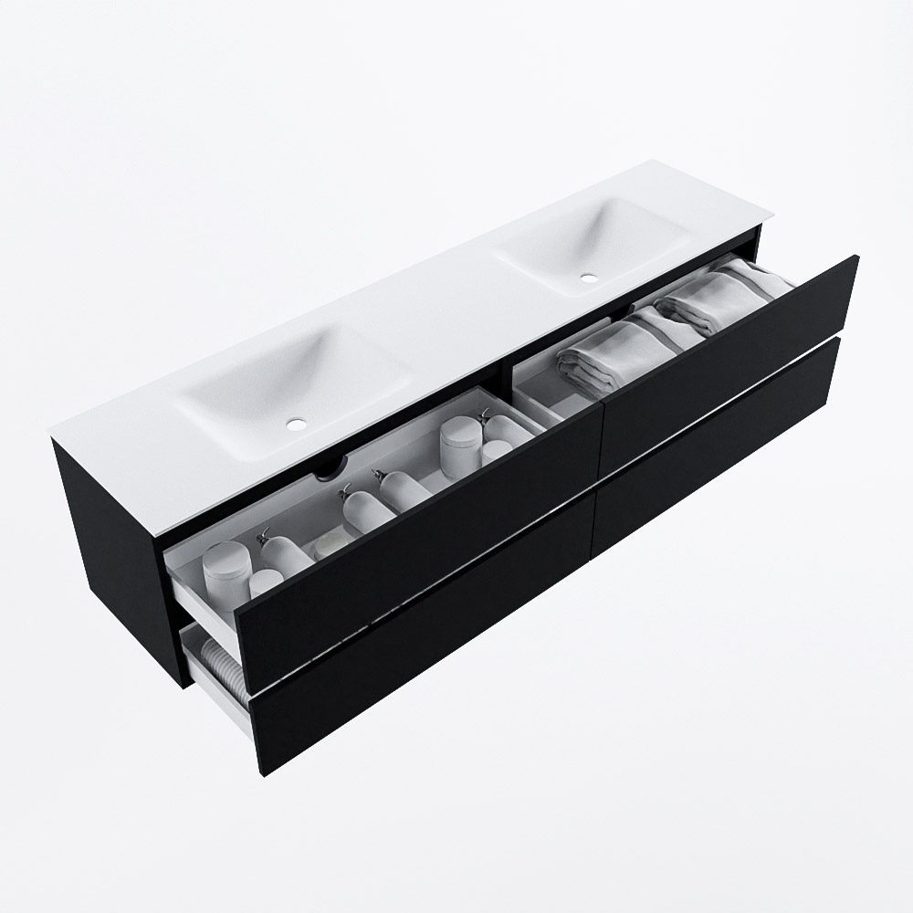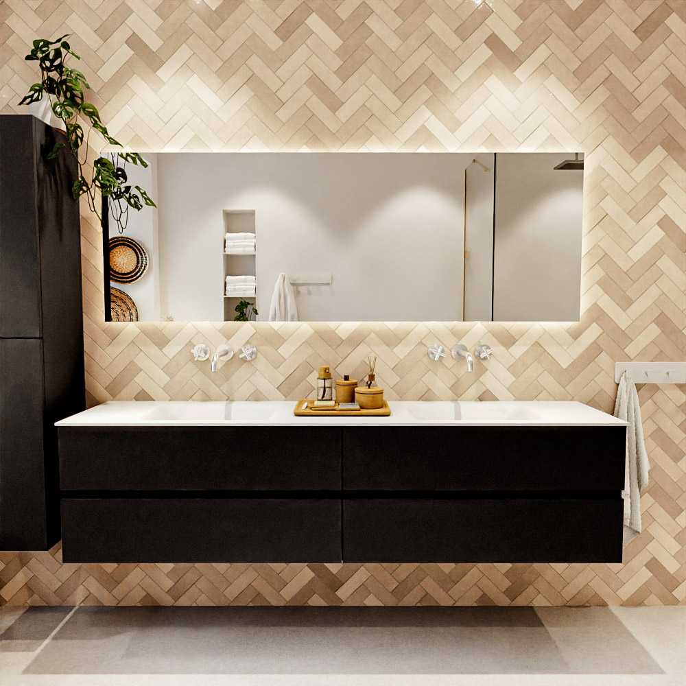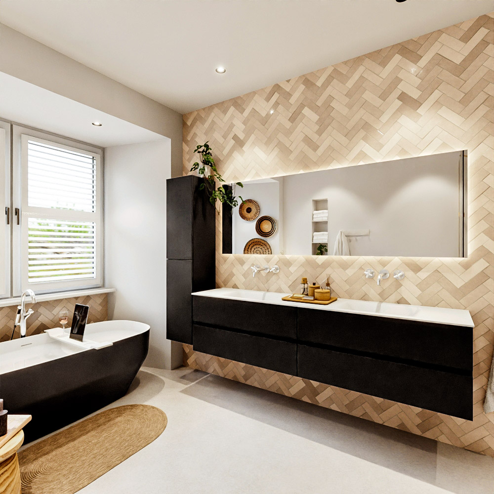 Ya sea que elija un color o un acabado de madera, un mueble de baño a medida, con o sin agujeros para grifos, el conjunto de muebles de baño Vica lo tiene todo. Con la serie Vica, puede elegir entre 3 modelos de lavabos: CLOUD y MOON en Solid Surface, con opciones de lavabo a la derecha, izquierda, en el medio o doble, y con o sin agujeros para grifos. También está el lavabo de cerámica DENIA con opciones en el medio y doble. El conjunto de muebles de baño Vica está disponible en una amplia gama de tamaños estándar, desde 60 cm hasta 200 cm, que aumentan en incrementos de 10 cm. El mueble de baño Vica está disponible en hasta 25 colores, incluyendo nuestros colores especiales Oro y Plata. Si no encuentra el tamaño o color ideal, siempre es posible hacer un pedido a medida. También puede coordinar su baño completo con columnas, bañeras, nichos y accesorios, todos en el mismo color. Con el conjunto de muebles de baño Vica, tendrá un mueble fantástico que completa su baño.