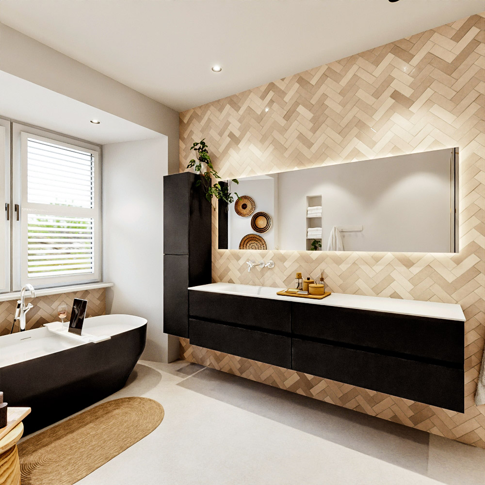 En español: Ya sea que elija un color o un acabado de madera, un mueble de baño a medida, con o sin agujeros para grifos, el conjunto de muebles de baño Vica lo tiene todo. Con la serie Vica, puede elegir entre 3 modelos de lavabos: CLOUD y MOON en Solid Surface, con opciones de lavabo a la derecha, izquierda, en el medio o doble, y con o sin agujeros para grifos. También está el lavabo de cerámica DENIA con opciones en el medio y doble. El conjunto de muebles de baño Vica está disponible en una amplia gama de tamaños estándar, desde 60 cm hasta 200 cm, que aumentan en incrementos de 10 cm. El mueble de baño Vica está disponible en hasta 25 colores, incluyendo nuestros colores especiales Oro y Plata. Si no encuentra el tamaño o color ideal, siempre es posible hacer un pedido a medida. También puede coordinar su baño completo con columnas, bañeras, nichos y accesorios, todos en el mismo color. Con el conjunto de muebles de baño Vica, tendrá un mueble fantástico que completa su baño.