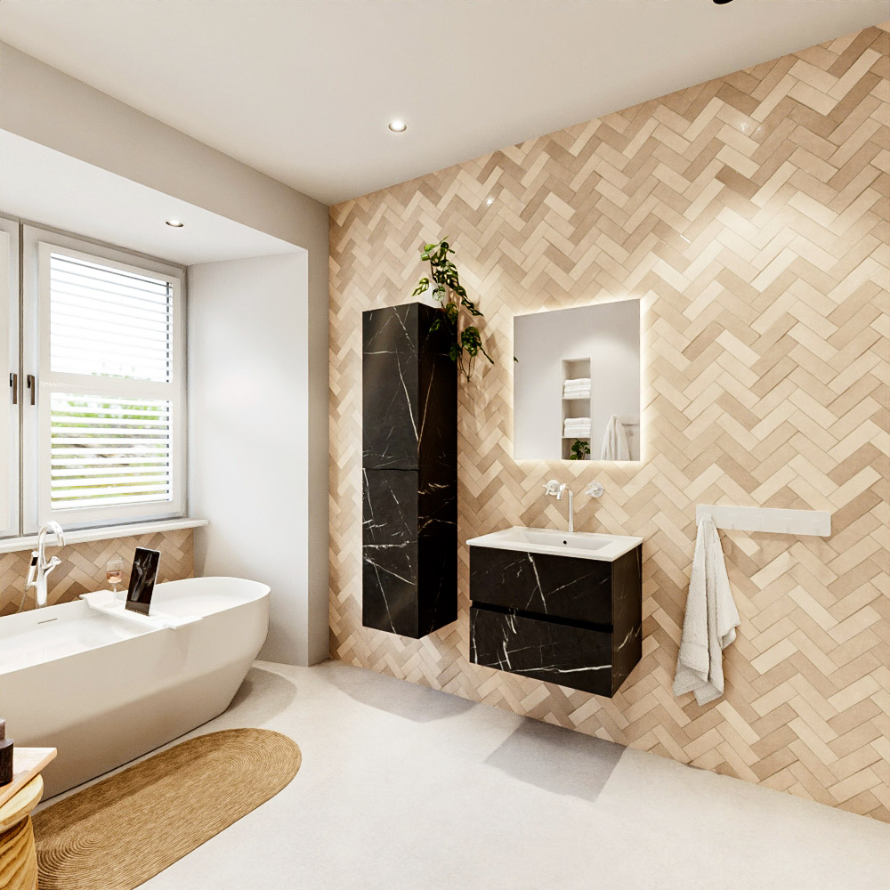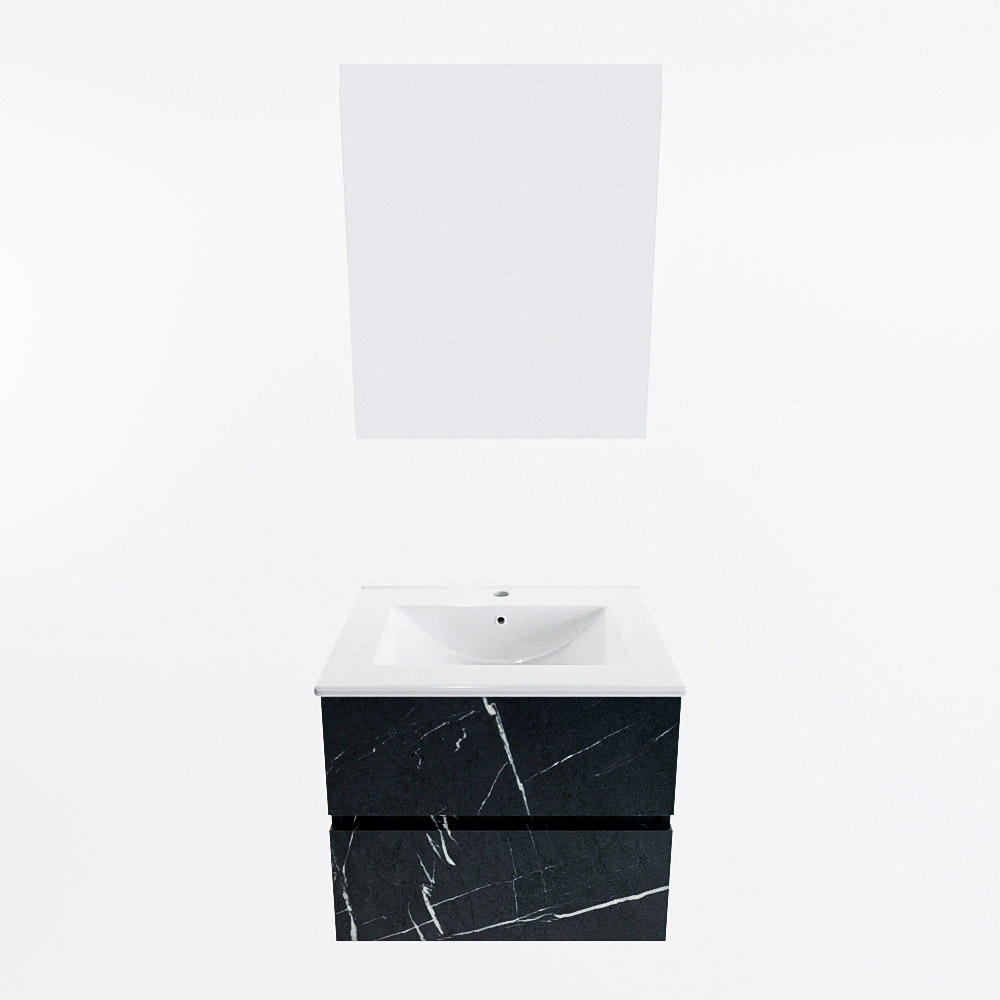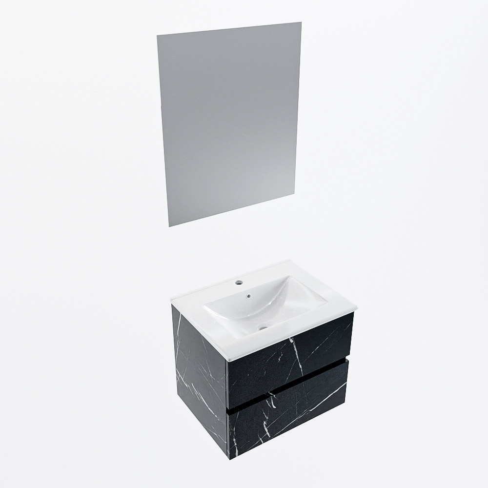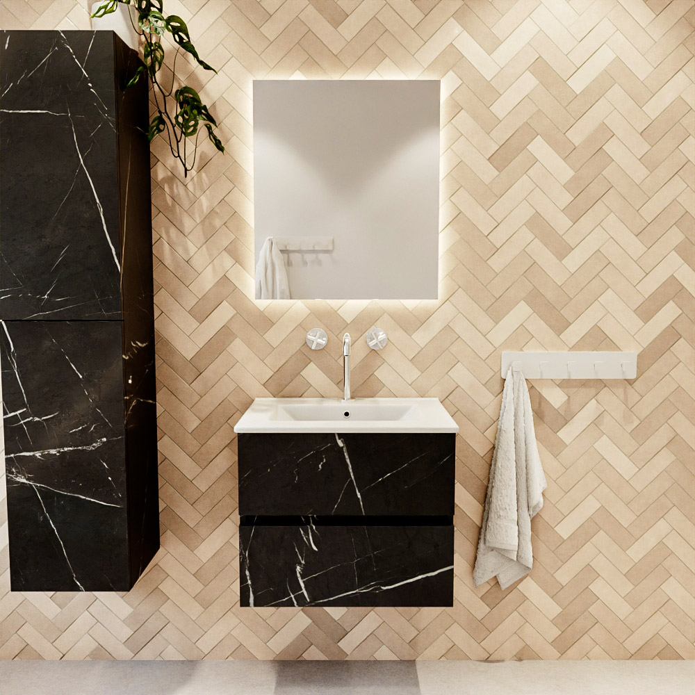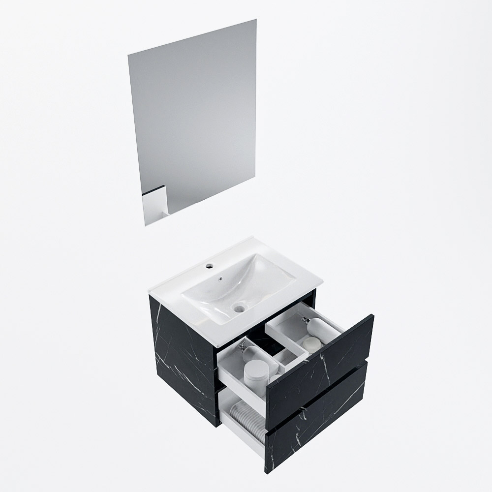 MONDIAZ VICA 60cm mueble de baño Marquina 2 cajones. Lavabo DENIA Centro 1 orificio color Blanco brillo con espejo LED.