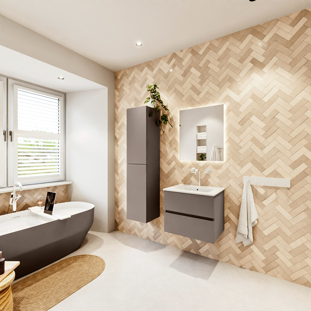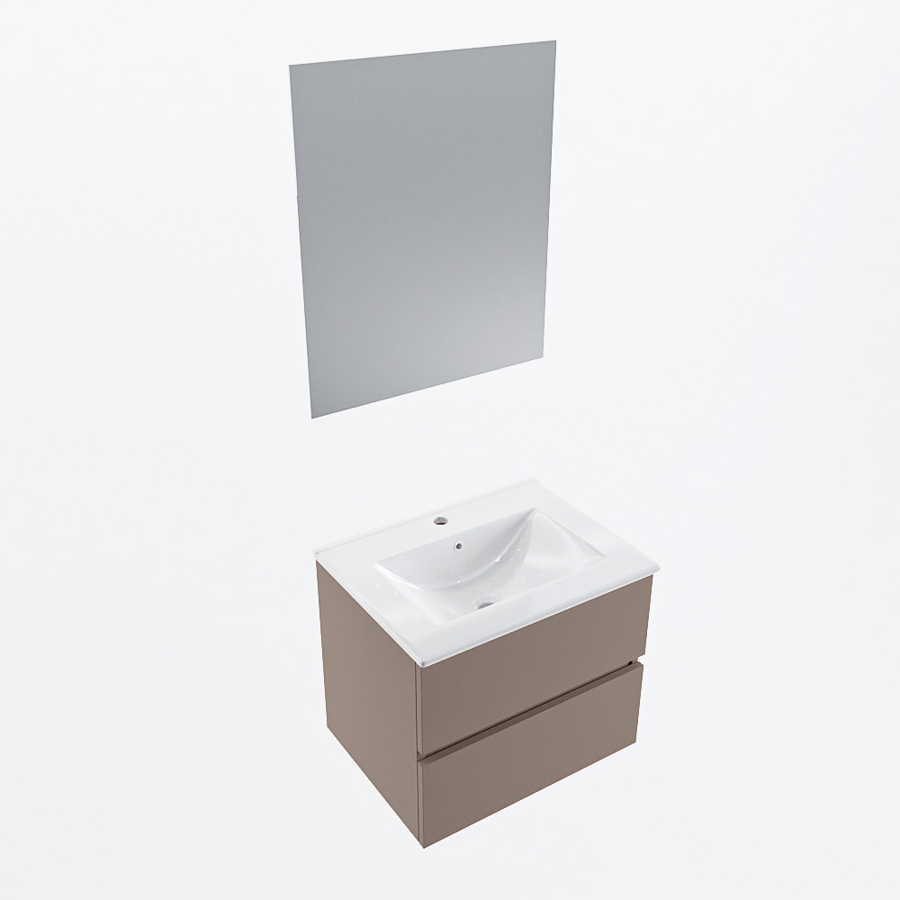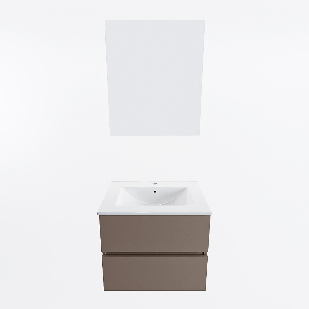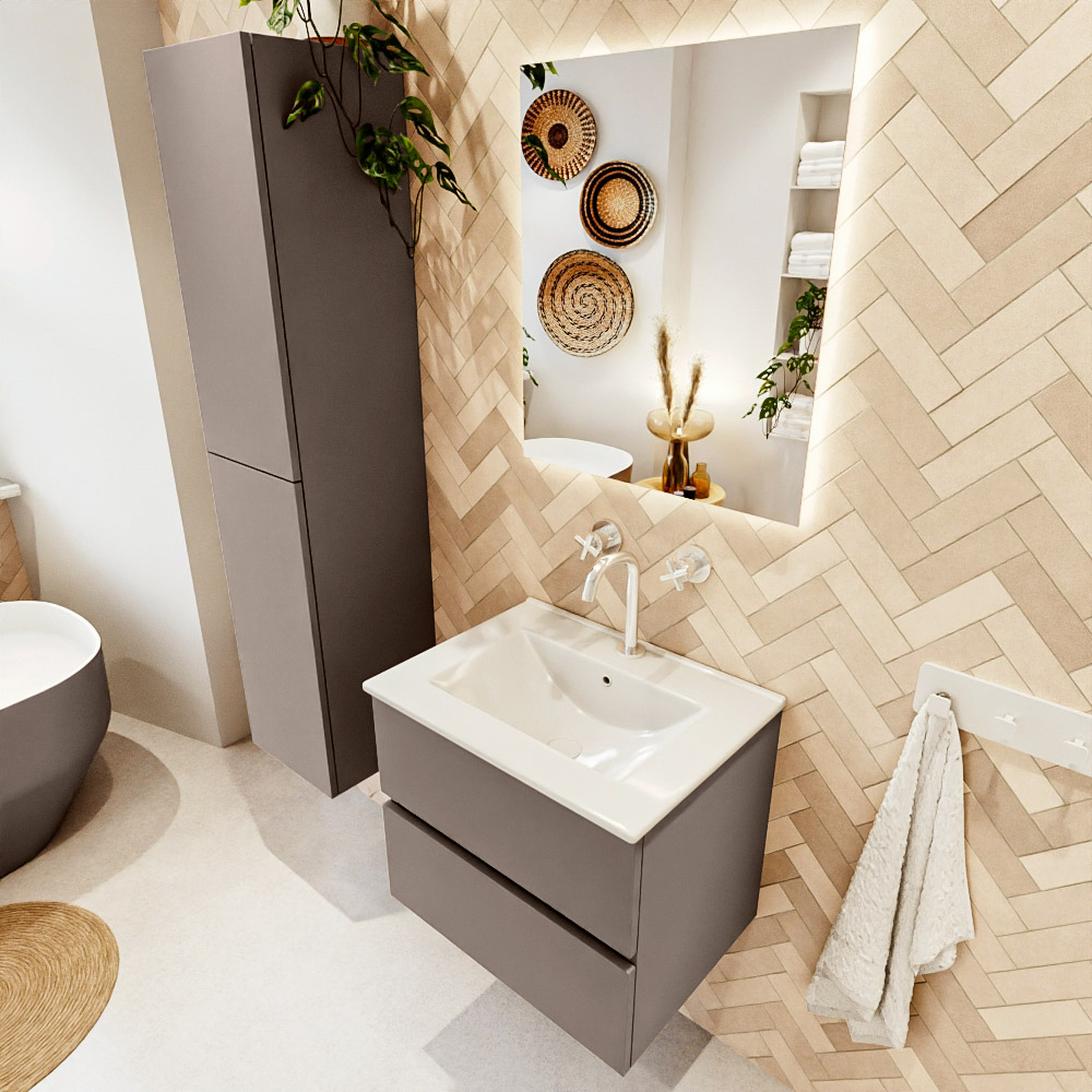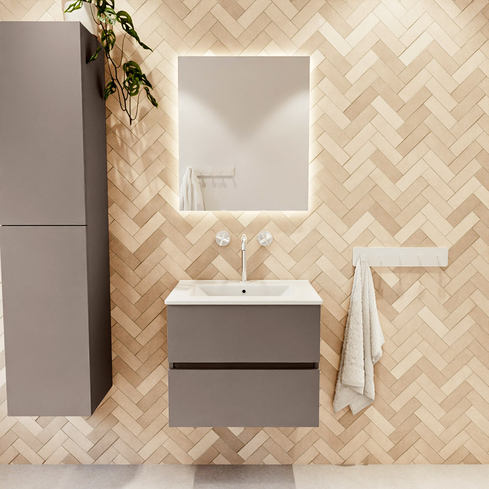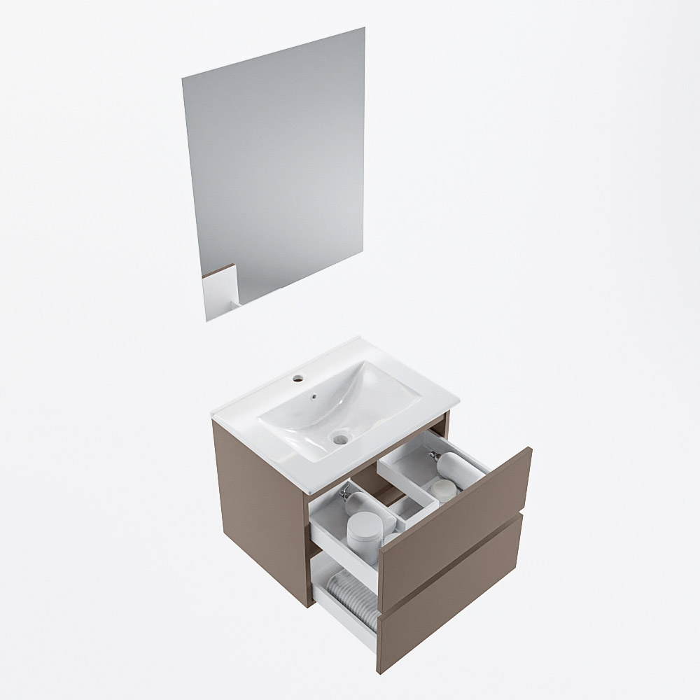 MONDIAZ VICA 60cm mueble de baño Smoke 2 cajones. Lavabo DENIA Centro 1 orificio color Blanco brillo con espejo LED.
